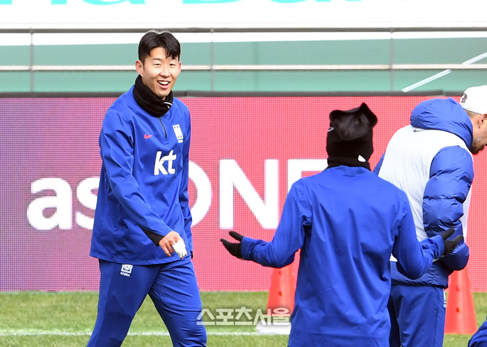 축구국가대표팀의 손흥민(왼쪽)이 20일 서울월드컵경기장에서 월드컵지역예선 태국과의 경기를 하루 앞두고 훈련을 하기 전 언론과 인터뷰를 한 이강인을 바라보며 웃으며 말을 건네고 있다. 2024. 3. 20. 박진업 기자 upandup@sportsseoul.com
