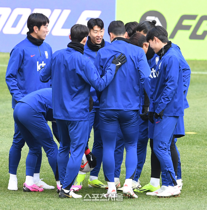 축구국가대표팀의 손흥민(가운데)이 20일 서울월드컵경기장에서 월드컵지역예선 태국과의 경기를 하루 앞두고 훈련을 하면서 동료들과 이야기를 나누고 있다. 2024. 3. 20. 박진업 기자 upandup@sportsseoul.com