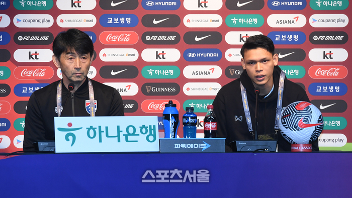 태국 축구국가대표팀의 마사타다 이시이 감독(왼쪽)과 공격수 수파차이 차이디드가 20일 서울월드컵경기장에서 월드컵지역예선 대한민국과의 경기를 하루 앞두고 진행된 기자회견에서 취재진의 질문에 답을 하고 있다. 2024. 3. 20. 박진업 기자 upandup@sportsseoul.com
