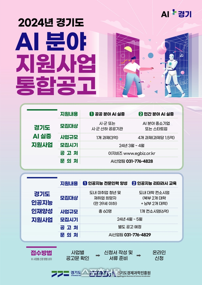 AI분야 지원사업 통합공고는 경기도 AI실증지원, 경기도 인공지능 인재양성 지원으로 구분된다. 시·군 또는 산하기관, AI분야 중소 스타트업, 재취업 희망자, 도내 대학 컨소시엄이 필요로 하는 상황에 맞게 각 사업별 자격요건을 확인해서 신청하면 된다.