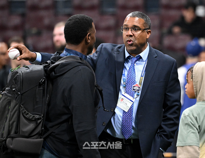 21일 오후 서울 고척스카이돔에서?‘MLB 월드투어 서울 시리즈’?LA 다저스와 샌디에이고 파드리스의 경기가 열렸다. 경기장을 찾은 에두아르도 페레즈가 켄 그리피 주니어와 이야기를 나누고 있다. 2024. 3. 21. 고척 | 최승섭기자 thunder@sportsseoul.com