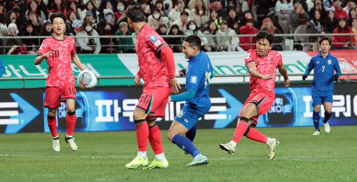 축구대표팀 ‘황선홍호’가 후반 16분 만에 동점골을 내줬다. 대표팀은 21일 서울월드컵경기장에서 진행중인 2026 북중미 월드컵 아시아 지역 2차 예선 조별리그 C조 3차전 태국과 홈경기에서 1-0으로 앞선 후반 16분 교체 자원 수파낫 무에안타에게 실점했다.