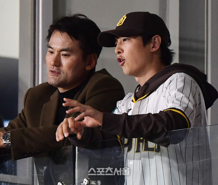 21일 서울 고척스카이돔에서 열린 ‘MLB 월드투어 서울 시리즈 2024’ LA 다저스와 샌디에이고 파드리스의 경기. 박찬호와 송중기가 함께 경기를 관람하고 있다. 2024. 3. 21. 고척 | 최승섭기자 thunder@sportsseoul.com