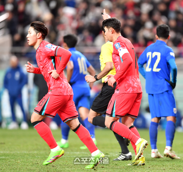 손흥민이 21일 서울월드컵경기장에서 열린 2026 제23회 FIFA 북중미월드컵 아시아 예선 2라운드 C조 3차전 대한민국과 태국의 경기 후반 교체투입된 이강인과 이야기를 나누고 있다 . 2024.03.21 상암 | 강영조기자 kanjo@sportsseoul.com