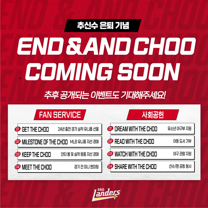 SSG는 “추신수가 2024시즌 마지막 현역 생활을 기념해 선수 본인이 직접 참여하는 이벤트와 CSR활동 등 구단과 공동 마케팅을 실시한다”며 “이번 공동 마케팅은 ‘끝이 아닌 또 다른 시작, End & And Choo’ 테마로 진행된다”고 밝혔다.