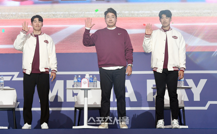 키움 히어로즈 홍원기 감독(가운데)과 김혜성(왼쪽), 송성문이 22일 서울 중구 소공동 롯데호텔 크리스탈볼룸에서 진행된 ‘2024 신한 SOL Bank KBO 미디어데이’ 행사에서 취재진을 향해 포즈를 취하고 있다. 2024. 3. 22. 박진업 기자 upandup@sportsseoul.com