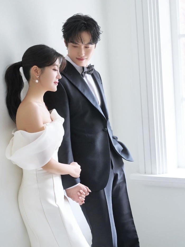 화보에서 이수민은 어깨가 드러난 머메이드 라인 드레스로 우아한 아름다움을 뽐냈다. 턱시도를 차려입은 원혁과 이수민은 선남선녀 비주얼 케미를 뽐냈다.