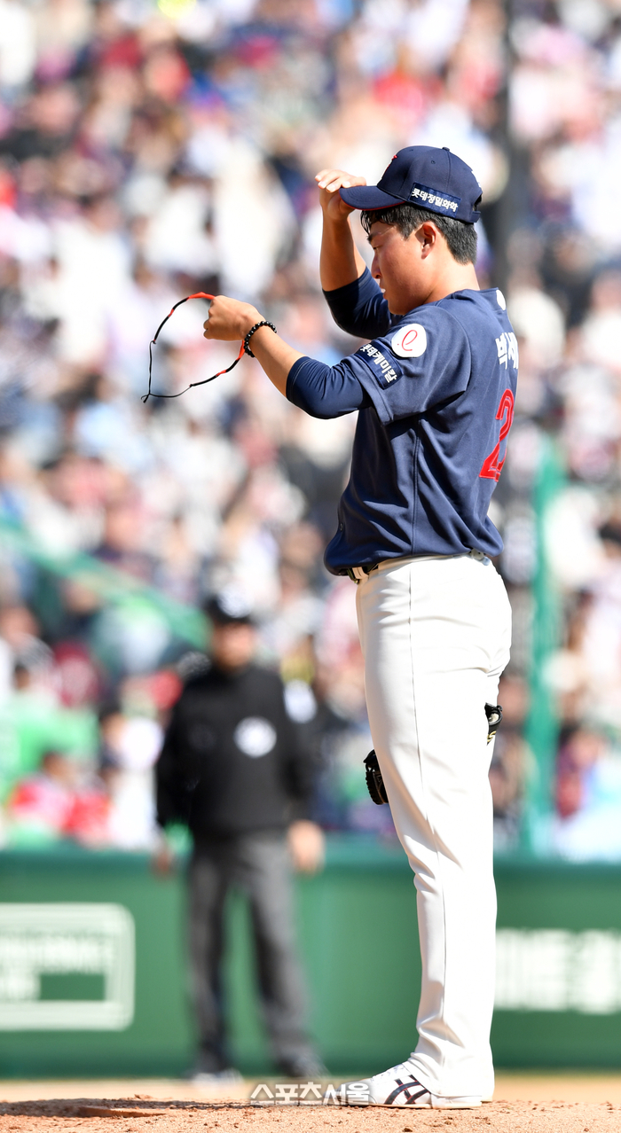 롯데 선발투수 박세웅이 24일 인천SSG랜더스필드에서 열린 ‘2024 신한 SOL 뱅크 KBO리그’ SSG랜더스와 롯데자이언츠 시즌 2차전 5회말 2사 후 2실점한 후 안경과 땀을 닦고 있다. 2024.03.24 문학 | 강영조기자 kanjo@sportsseoul.com