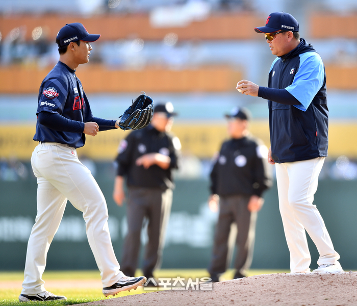 롯데 주형광 투수코치가 24일 인천SSG랜더스필드에서 열린 ‘2024 신한 SOL 뱅크 KBO리그’ SSG랜더스와 롯데자이언츠 시즌 2차전 8회말 우강훈을 마운드에 올리고 있다. 2024.03.24 문학 | 강영조기자 kanjo@sportsseoul.com