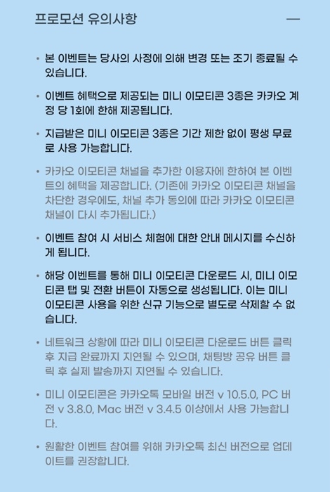 또 ‘만약 사용자가 앞으로 ㈜카카오가 제공하는 이모티콘 및 이모티콘 플러스 관련 문자 메시지를 수신하고 싶지 않을 경우, 카카오 고객센터로 문의하여 본 동의를 철회할 수 있습니다’라며 ‘해당 동의 이력은 유저가 동의 철회 시까지 보관됩니다’라고 게재했다.