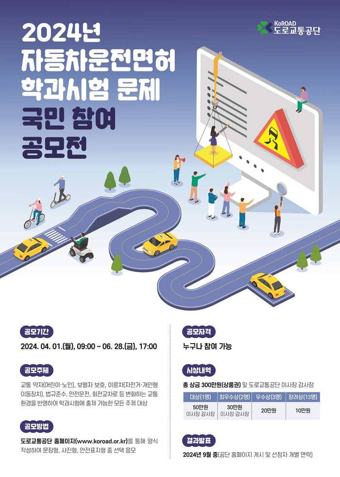 도로교통공단(이사장 직무대행 서범규)은 ‘2024년 자동차운전면허 학과시험문제 국민참여 공모전’을 4월 1일(월)부터 6월 28일(금)까지 개최하고, 출제 가능한 모든 주제를 대상으로 문제를 모집한다.