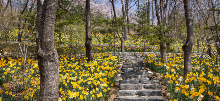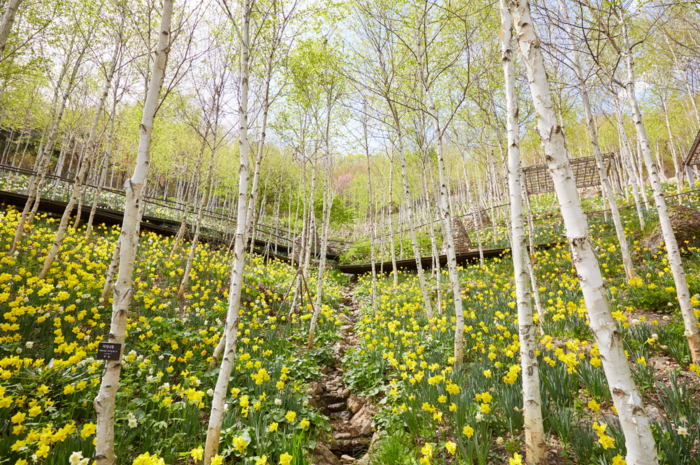 특히, 2000여 그루의 하얀 자작나무와 노란 수선화 군락이 어우러진 ‘자작나무숲’의 이색적인 풍광은 상춘객들의 마음과 시선을 단번에 사로잡는다. 화담숲에서만 볼 수 있는 봄의 장관이다.