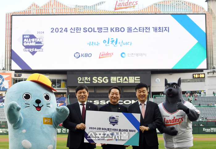 허구연 KBO총재가 26일 인천SSG랜더스필드에서 열린 2024 KBO리그 한화이글스와 SSG랜더스의 경기에 앞서 2024년 프로야구올스타전 개최지로 인천을 발표한 후 안종복 인천시장과 민경삼 SSG랜더스 대표가 기념촬영을 하고 있다. 2024.03.26 문학 | 강영조기자 kanjo@sportsseoul.com