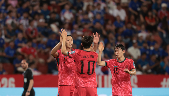 축구대표팀은 26일 태국 방콕의 라자망갈라 스타디움에서 진행 중인 2026 북중미월드컵 아시아 지역 2차 예선 태국과의 경기 전반전을 1-0으로 앞선 채 마쳤다.