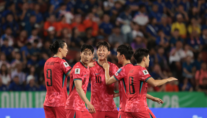 황선홍 감독이 이끄는 축구대표팀은 26일 태국 방콕의 라자망갈라 스타디움에서 태국과 2026 북중미월드컵 아시아 지역 2차 예선에서 3-0 완승을 거뒀다.