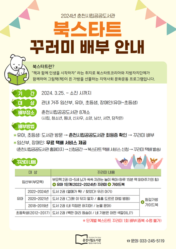 춘천시립도서관은 2009년부터 꾸준히 북스타트 꾸러미를 배부하고 있다. 특히 2024년에는 관내 거주하는 임산부에게 북스타트 꾸러미를 무료로 택배 송부한다.