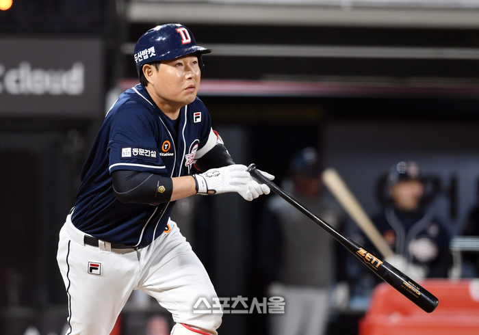 두산 베어스 양의지가 27일 수원 KT위즈파크에서 열린 2024 KBO리그 KT 위즈와 경기 3회초 무사 1-3루 상황에서 KT 선발 고영표를 상대로 행운의 1타점 적시타를 치고 있다. 2024. 3. 27. 수원 | 박진업 기자 upandup@sportsseoul.com