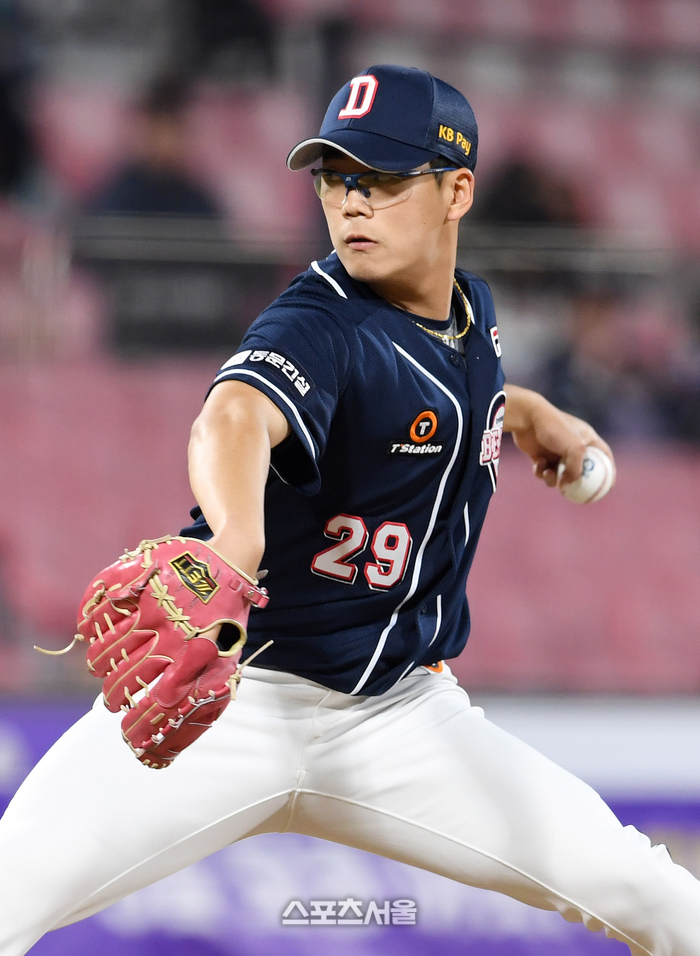 두산 베어스 이병헌이 27일 수원 KT위즈파크에서 열린 2024 KBO리그 KT 위즈와 경기 8회말 등판해 힘차게 공을 던지고 있다. 2024. 3. 27. 수원 | 박진업 기자 upandup@sportsseoul.com