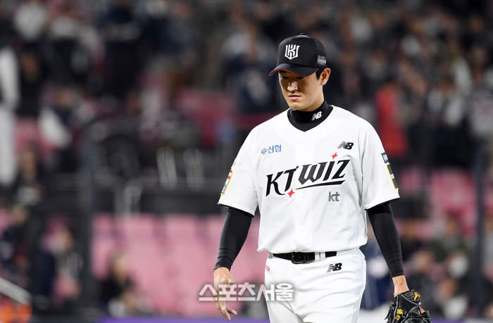 KT 위즈 선발투수 고영표가 27일 수원 KT위즈파크에서 열린 2024 KBO리그 두산 베어스와 경기 5회초 무사 1-3루 상황에서 마운드에서 내려가고 있다. 고영표는 4이닝 13피안타 9실점의 부진한 모습을 보였다. 2024. 3. 27. 수원 | 박진업 기자 upandup@sportsseoul.com