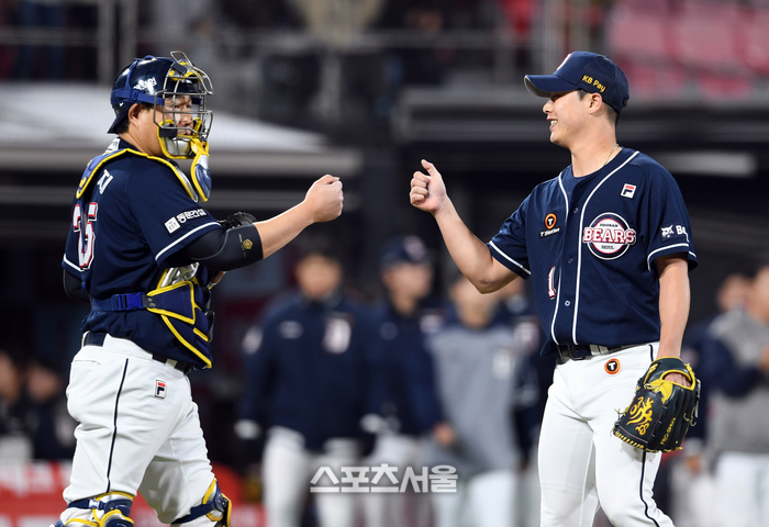 두산 베어스 박치국(오른쪽)이 27일 수원 KT위즈파크에서 열린 2024 KBO리그 KT 위즈와 경기 9회말 2사 만루 상황에 등판해 KT 배정대를 우익수 뜬공으로 잡아내며 승리를 지켜낸 뒤 포수 양의지와 하이파이브를 하고 있다. 2024. 3. 27. 수원 | 박진업 기자 upandup@sportsseoul.com