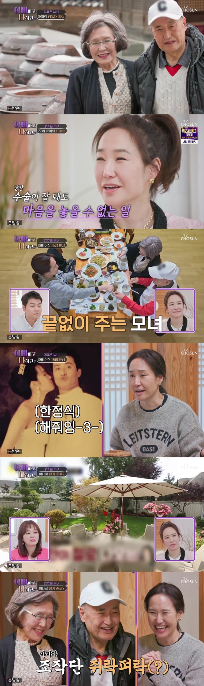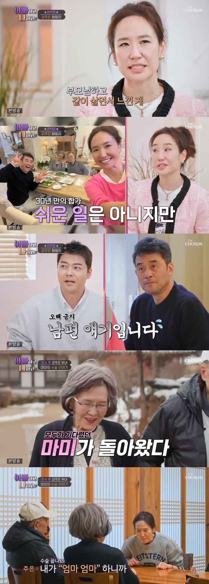MC 전현무가 건강 상태를 묻자 강주은은 “12월에 대장 수술을 받으셨고, 이제 건강을 많이 찾으셨다”라며 “5개월간 어른들과 같이 살아보니 쉬운 일은 아니더라. 행복한 건 맞지만 장단점이 있더라”라고 솔직하게 말해 웃음바다가 됐다.