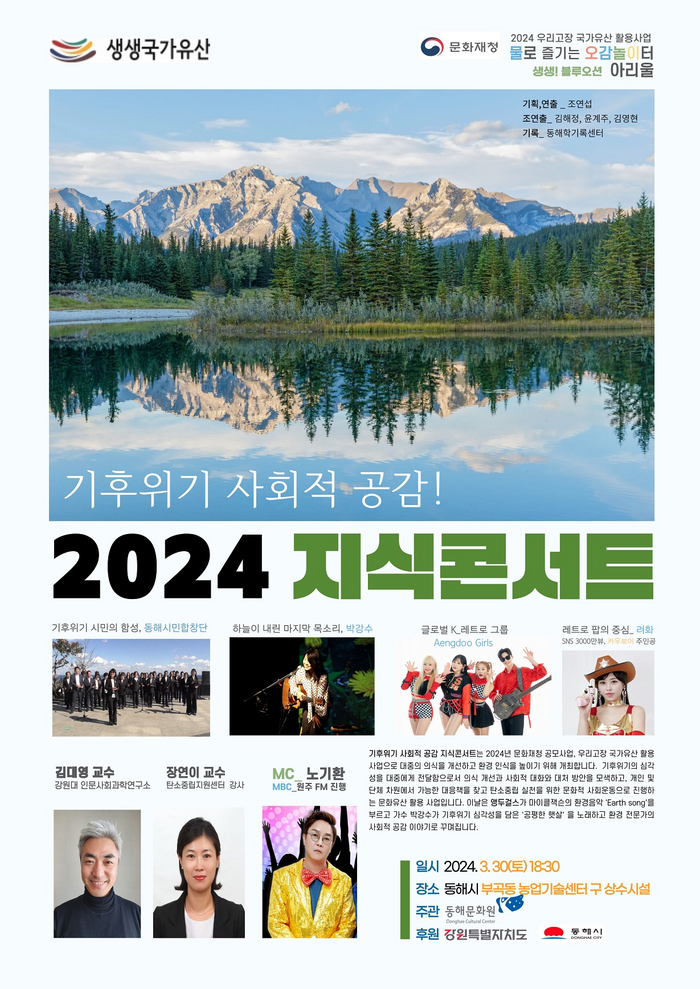 [스포츠서울ㅣ김기원기자] 동해시(시장 심규언)는 동해문화원(원장 오종식)이 기후위기, 탄소중립과 같은 다중위기 시대, 물의 가치 등 환경을 주제로 하는 ‘기후위기 사회적 공감, 2024 지식콘서트’를 개최한다고 밝혔다.
