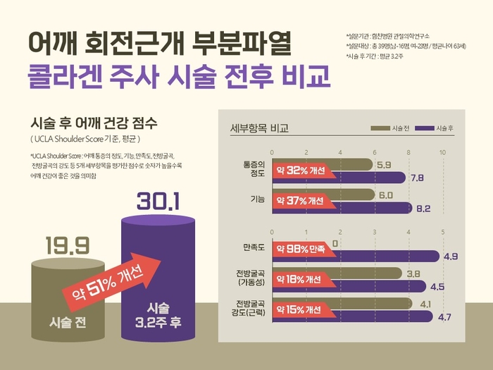 실제 힘찬병원 관절의학연구소가 지난해 12월부터 약 한 달간 회전근개 부분파열로 콜라겐 주사치료를 받은 환자 39명의 시술 전과 시술 후(평균 3.2주) 상태를 조사한 결과 △어깨 통증의 정도와 기능 △전방굴곡 △어깨 근력 △만족도 등 5개 항목 총점이 시술 전 평균 19.9점에서 시술 후 평균 30.1점으로 51%가량 좋아진 것으로 나타났다. 일반적으로 총점 29점 이상이면 어깨 건강이 좋은 상태라고 평가할 수 있다.
