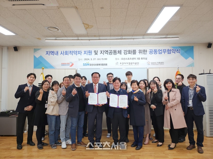 〔스포츠서울│오산=좌승훈기자〕오산시시설관리공단과 오산시사회복지협의회 오산시가족센터는 27일 오산스포츠센터에서 상호간 폭넓은 인적·물적 교류를 위한 업무 협약식을 진행했다.