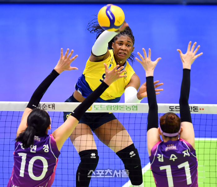 현대 모마가 28일 수원실내체육관에서 열린 2023-2024 V리그 여자부 현대건설과 흥국생명 챔프결정전 1차전에서 흥국 이중블로킹을 피해 공격을 시도하고 있다. 2024.03.28 수원 | 강영조기자 kanjo@sportsseoul.com