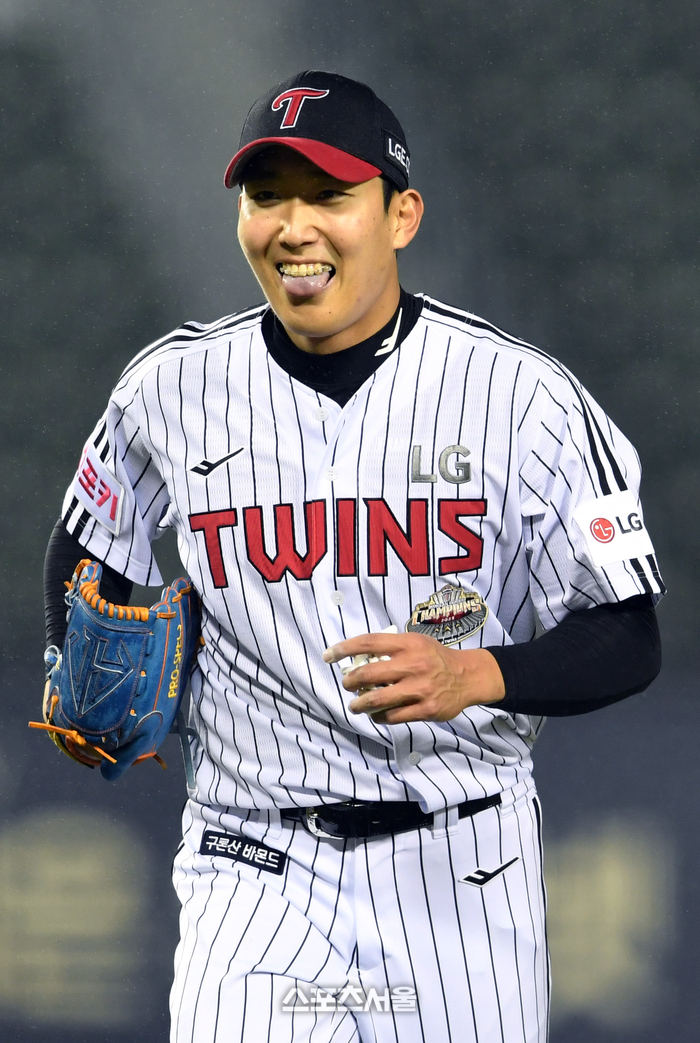 LG 트윈스 손주영이 28일 잠실구장에서 열린 2024 KBO리그 삼성 라이온즈와 경기 5회초 수비를 마치고 덕아웃으로 들어가면서 밝게 웃고 있다. 손주영은 6이닝 무실점의 후투를 펼쳤다. 2024. 3. 28. 잠실 | 박진업 기자 upandup@sportsseoul.com