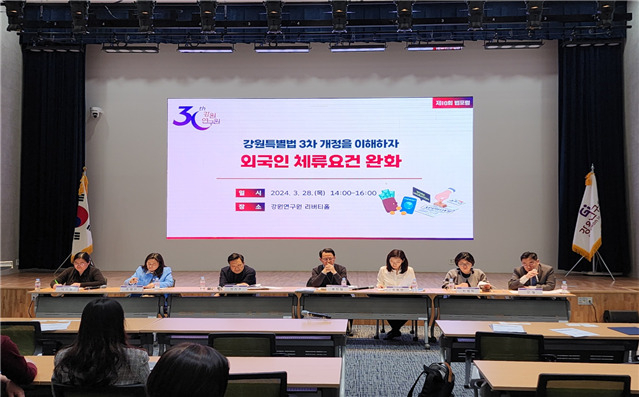 [스포츠서울ㅣ춘천=김기원기자] 강원연구원(원장 현진권)은 지난 3월 28일(목) 14시 강원연구원 리버티홀에서 “강원특별법 3차 개정을 이해하자 : “외국인 체류요건 완화를 위한 법·제도적 방안”을 주제로 제10회 법포럼을 개최하였다.