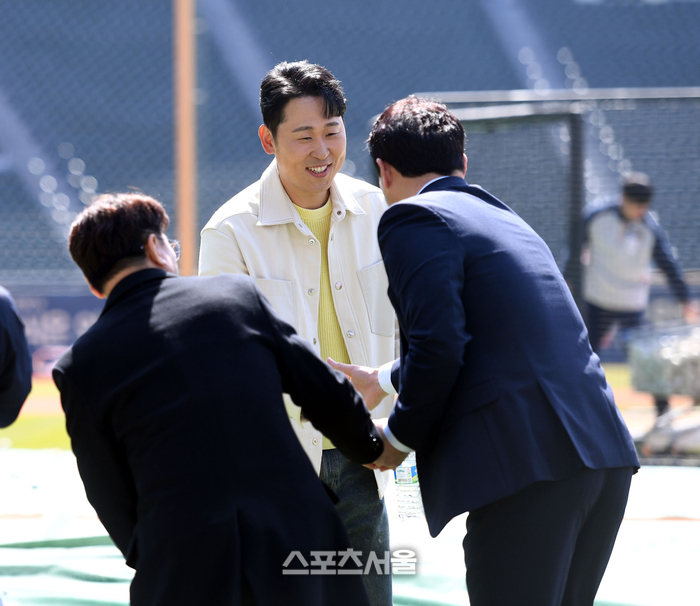 윤석민 해설위원이 31일 잠살야구장에서 열리는 2024 KBO리그 두산과 KIA와 경기에 앞서 서재응 해설위원과 악수를 하고 있다. 2024. 3. 31. 잠실 | 최승섭기자 thunder@sportsseoul.com