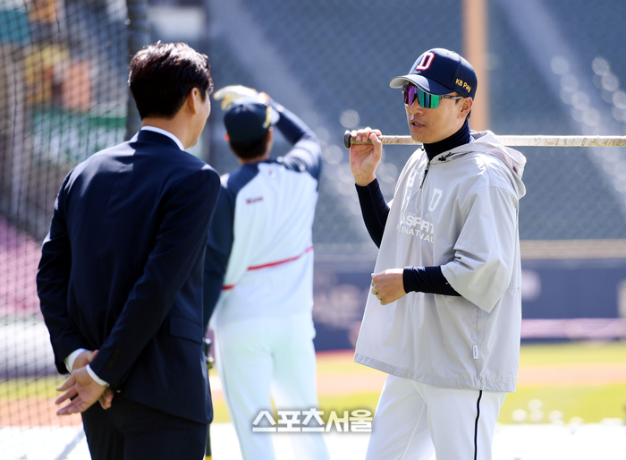 두산 이승엽 감독이 31일 잠살야구장에서 열리는 2024 KBO리그 KIA와 경기에 앞서 심수창 해설위원과 이야기를 나누고 있다. 2024. 3. 31. 잠실 | 최승섭기자 thunder@sportsseoul.com