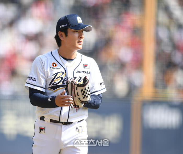 두산 선발투수 곽빈이 31일 잠살야구장에서 열린 2024 KBO리그 KIA와 경기 4회초 투구 후 덕아웃으로 들어모며 야수를 향해 박수를 치고 있다. 2024. 3. 31. 잠실 | 최승섭기자 thunder@sportsseoul.com