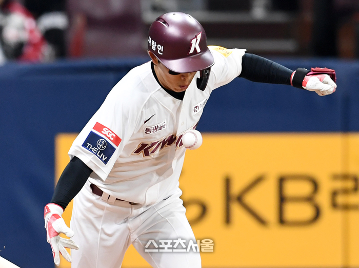 키움 히어로즈 박수종이 31일 고척스카이돔에서 열린 2024 KBO리그 LG 트윈스와 경기 4회말 무사 1루 상황에서 번트를 시도한 뒤 자신의 타구를 피하려 하고 있다. 비디오판독 결과 타구에 맞은 것으로 인정되어 아웃. 2024. 3. 31. 고척 | 박진업 기자 upandup@sportsseoul.com