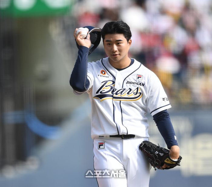 두산 투수 최지강이 31일 잠살야구장에서 열린 2024 KBO리그 KIA와 경기 7회초 1사2,3루 상대 박찬호 사구에 사과하고 있다. 2024. 3. 31. 잠실 | 최승섭기자 thunder@sportsseoul.com