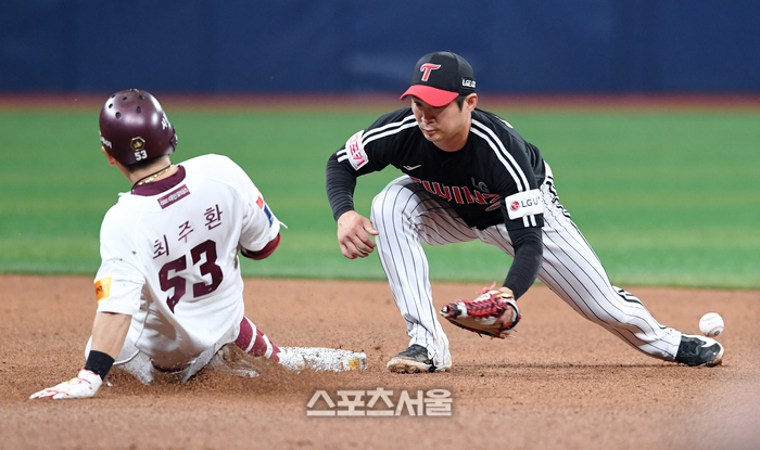키움 히어로즈 최주환이 31일 고척스카이돔에서 열린 2024 KBO리그 LG 트윈스와 경기 7회말 무사 LG 투수 백승현을 상대로 2루타를 치고 베이스를 향해 슬라이딩을 하는 사이 LG 유격수 오지환이 공을 놓치면서 태그를 하고 있다. 2024. 3. 31. 고척 | 박진업 기자 upandup@sportsseoul.com