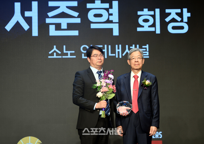 소노 인터내셔널 서준혁 회장이 1일 그랜드 인터컨티넨탈 서울 파르나스에서 열린 2023-2024 프로농구 시상식에서 공로상을 수상했다. 소노 이기완 단장이 대리수상후 김희옥 총재와 기념촬영을 하고 있다. 2024. 4. 1. 최승섭기자 thunder@sportsseoul.com