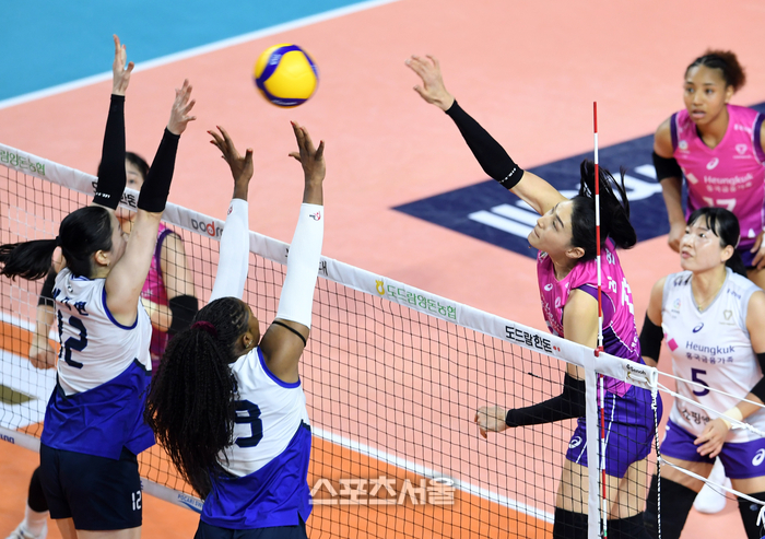 흥국생명 김연경(오른쪽)이 1일 인천 삼산월드체육관에서 열린 2023-2024 V리그 여자부 현대건설과 챔피언결정전 3차전에서 스파이크 공격을 하고 있다. 2024. 4. 1. 삼산 | 박진업 기자 upandup@sportsseoul.com