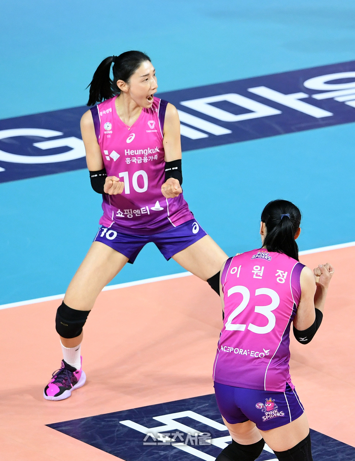 흥국생명 김연경(왼쪽)이 1일 인천 삼산월드체육관에서 열린 2023-2024 V리그 여자부 현대건설과 챔피언결정전 3차전에서 서브 에이스를 기록한 뒤 기뻐하고 있다. 2024. 4. 1. 삼산 | 박진업 기자 upandup@sportsseoul.com