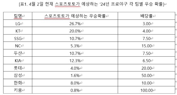타팀들의 배당률은 ▲KT(4.00) ▲KIA(6.50) ▲두산(7.50) ▲SSG(7.50) ▲한화(10.00) ▲NC(15.00) ▲롯데(20.00) ▲삼성(50.00)으로 나타났다.