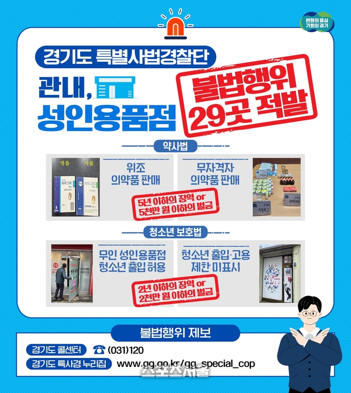 〔스포츠서울│수원=좌승훈기자〕경기도는 지난 달 1일부터 23일까지 성인용품점 등 115개소를 집중 단속해 청소년 출입을 제한하지 않은 무인성인용품점 9곳과 가짜 발기부전치료제를 판매한 20곳을 적발하고 가짜 의약품 3000여 정을 현장에서 압수했다고 2일 밝혔다.