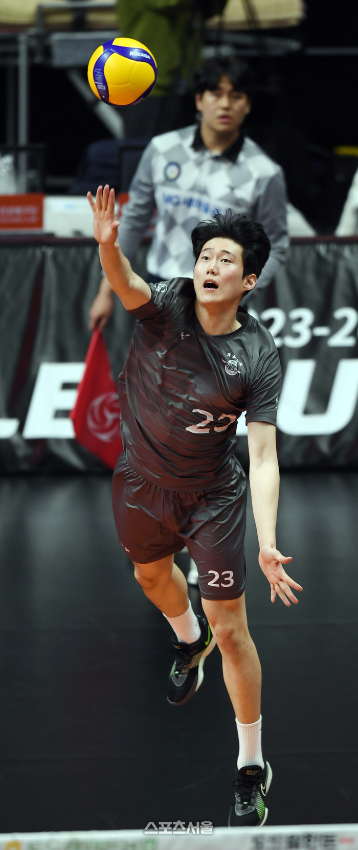 대한항공 김민재가 2일 안산상록수체육관에서 열린 2023-2024 V리그 남자부 챔피언결정전 OK금융그룹과 대한한공의 3차전에서 서브를 넣고 있다. . 2024.04,02. 안산 | 강영조기자 kanjo@sportsseoul.com