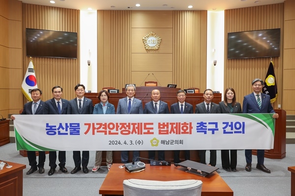 이에 전국 최대의 농군인 해남군의회는 농산물 가격안정제도 법제화를 이루기 위한 염원을 담아 ▲ 지속 가능한 먹거리 생산 토대를 구축하고 식량안보 강화 방안을 마련하라. ▲ 대안 없는 반대, 임시방편식 대책만 내놓지 말고 농가의 경쟁력 향상을 위한 장기적인 대책을 강구하라. ▲ 농업의 공익적 가치를 외면하지 말고 농산물 가격안정제도를 즉각 도입하라고 촉구 건의했다.