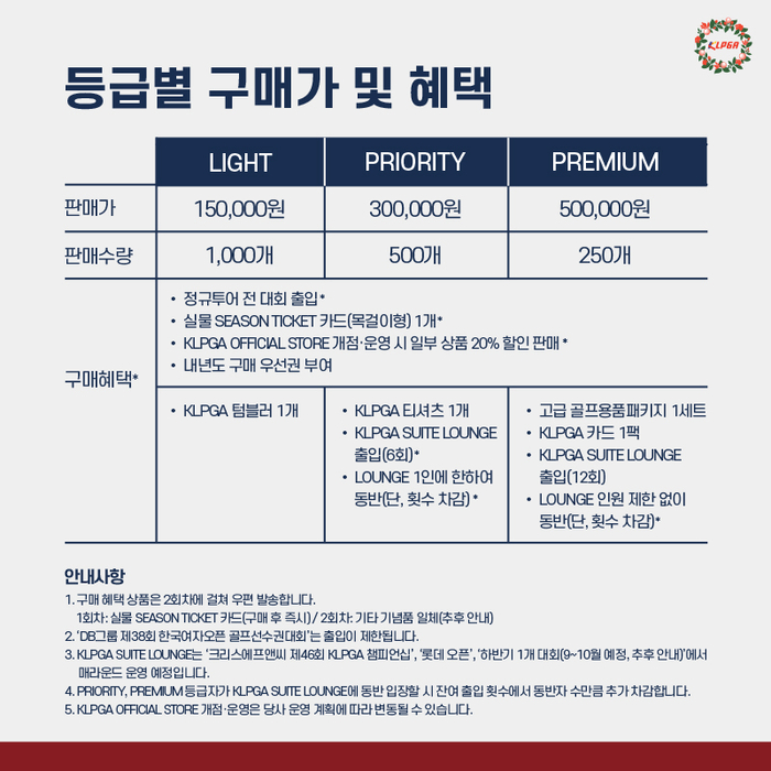 한국여자프로골프협회(KLPGA)는 올해 정규투어 한 시즌을 모두 볼 수 있는 ‘시즌권’을 최대 50만원에 판매하고 있다. 프리미엄 등급은 최대 12차례 스위트 라운지 출입이 가능하고, 골프용품패키지 등을 선물로 준다.