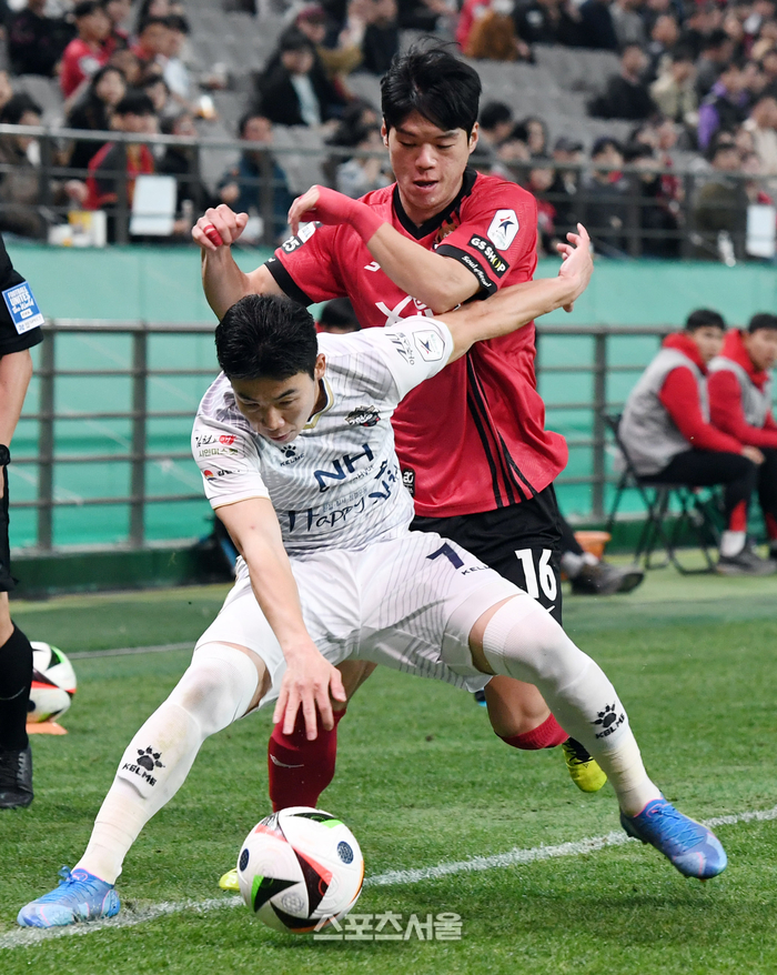 김천 상무 김태현(아래)이 3일 서울월드컵경기장에서 열린 2024 K리그1 FC서울과 경기에서 FC서울 최준에 앞서 공을 지켜내고 있다. 2024. 4. 3. 박진업 기자 upandup@sportsseoul.com