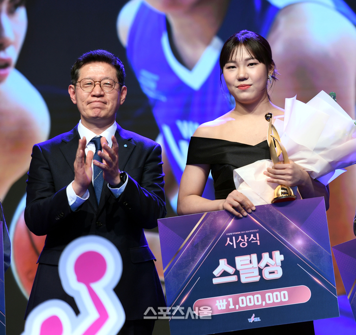 우리은행 박지현이 4일 여의도 63컨벤션센터에서 열린 2023-2024 여자프로농구 시상식에서 스틸상을 수상한 후 우리은행 이명수 단장과 기념촬영을 하고 있다.