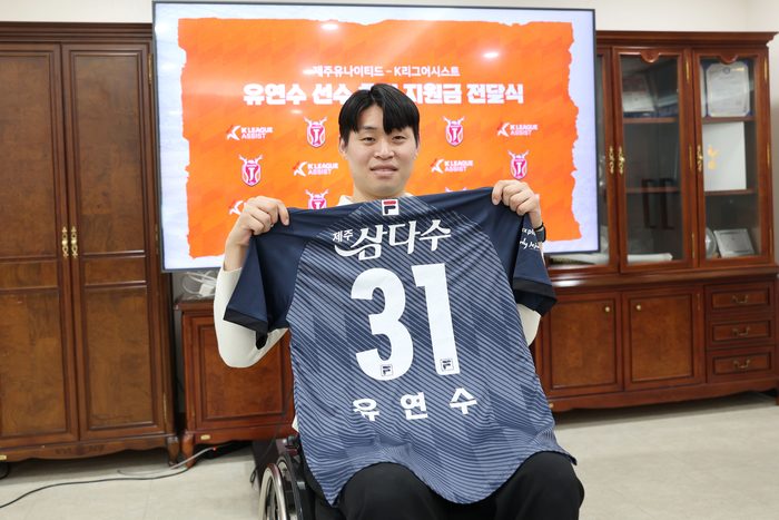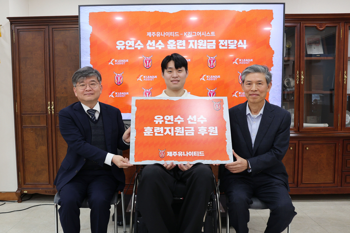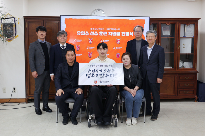 제주 유나이티드와 K리그 어시스트가 5일 서울 신문로 축구회관에서 유연수의 향후 패럴림픽 등 활동 지원을 위한 훈련 지원금 명목 기부금을 전달했다. 유연수와 그의 가족 그리고 제주 구단 구창용 대표, 김현희 단장, K리그 어시스트 곽영진 이사장이 이 자리에 함께했다