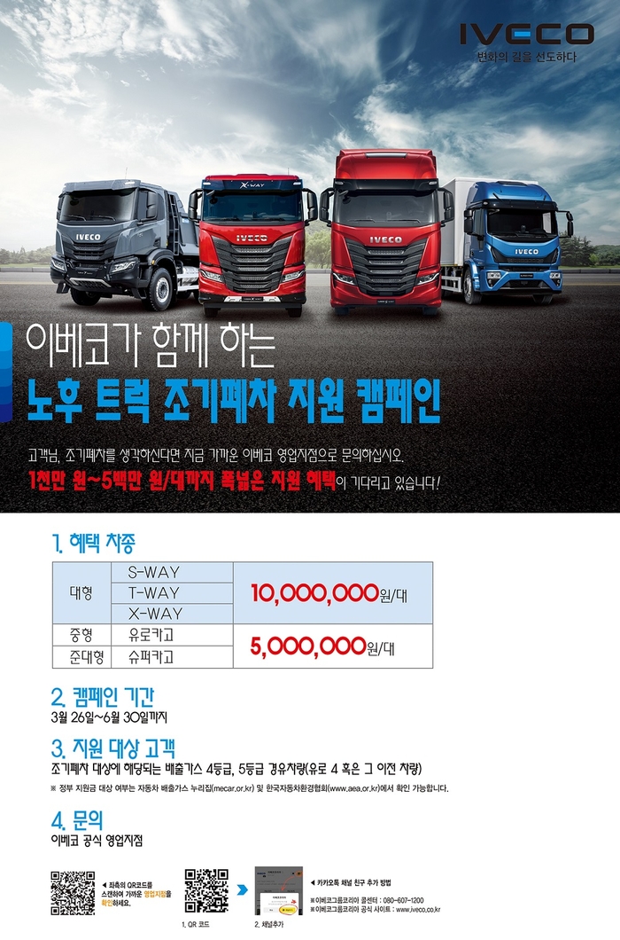 [스포츠서울 | 배우근 기자] 이베코코리아는 오는 6월 30일까지 진행하는 노후트럭 조기폐차 지원 캠페인에 동참한다. 고객들에겐 파격 혜택을 제공한다.