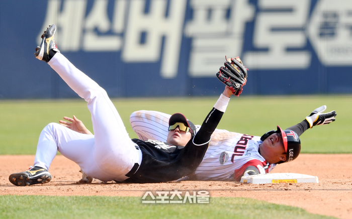 LG 트윈스 문보경(오른쪽)이 7일 잠실구장에서 열린 2024 KBO리그 KT 위즈와 경기 4회말 1사 1-2루 상황에서 포수 견제에 걸려 KT 유격수 김상수에 태그아웃된 뒤 세이프라는 제스처를 하고 있다. 비디오판독 결과 원심 아웃 판정 유지. 2024. 4. 7. 잠실 | 박진업 기자 upandup@sportsseoul.com